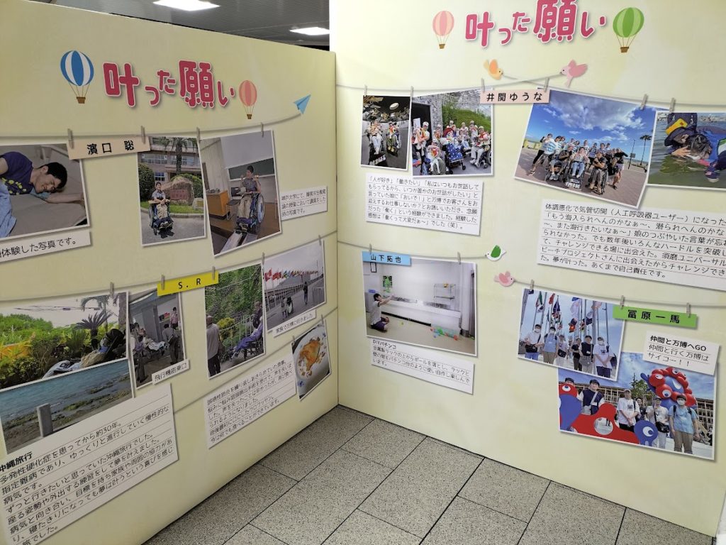 JR六甲道駅では「共生社会展」を実施。「あなたの夢や願いを届けよう」というテーマで、障害のある方から募集した「私の願い」「叶った願い」などの写真や作品のパネル展示が行われました。また駅前では被災地の障がい者への支援募金活動が行われ、多くの方に募金いただきました。